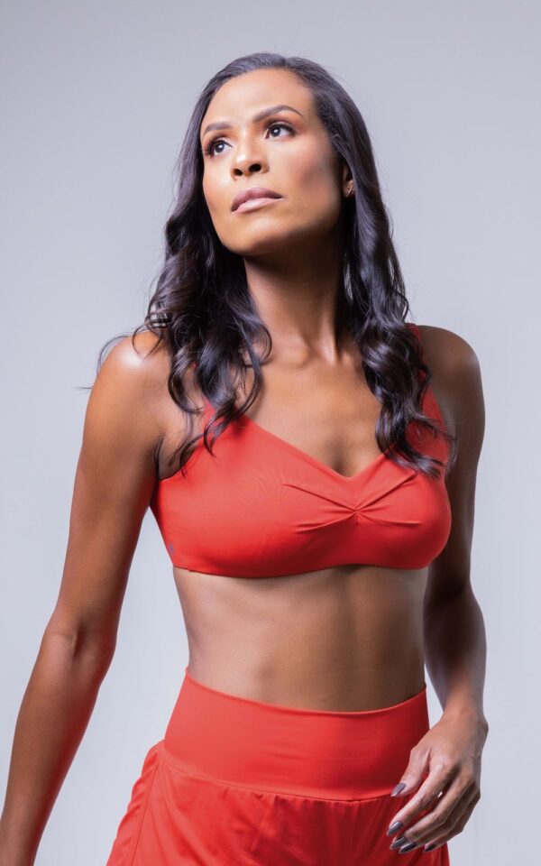 Top com tecido brilhante. Bojo removível, com recortes frontais e traseiros, proporcionando sustentação para a prática de exercícios de médio impacto. É a combinação ideal de elegância e conforto para suas atividades físicas.